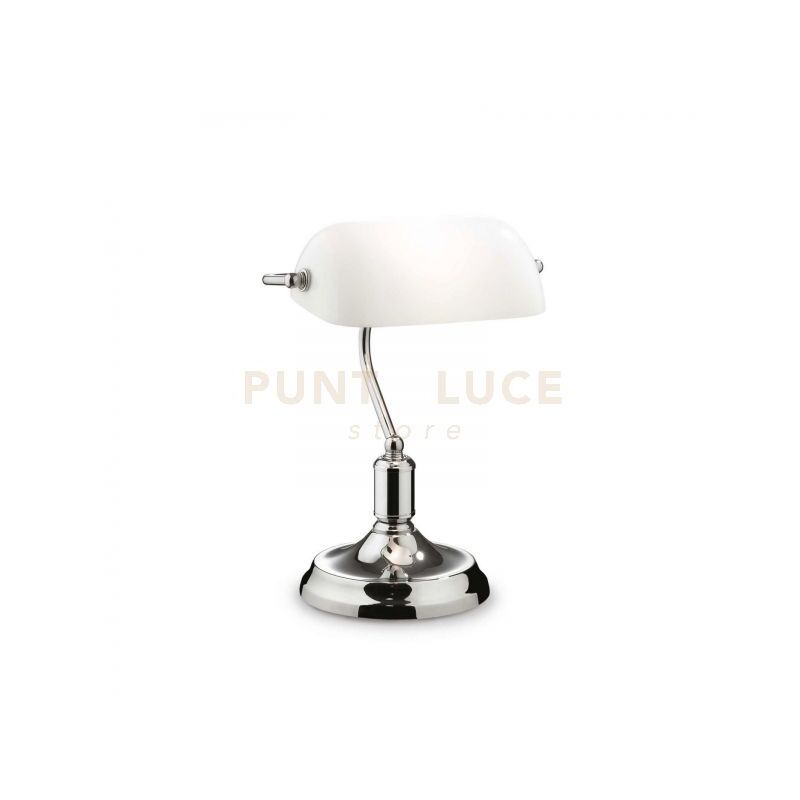 Lampada da tavolo con montatura in metallo e diffusore in vetro soffiato e incamiciato.