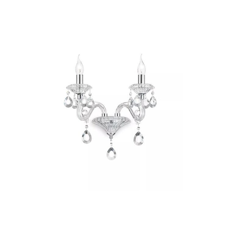 Montatura e dettagli in metallo dorato o cromato. Centrale composto da blocchi di cristallo molato. Bracci in vetro soffiato con interno dorato nella versione oro. Elementi decorativi in vetro trasparente e cristallo molato. L 340 x H 290 x P 250 mm max 2 x 40W E14 IP:20