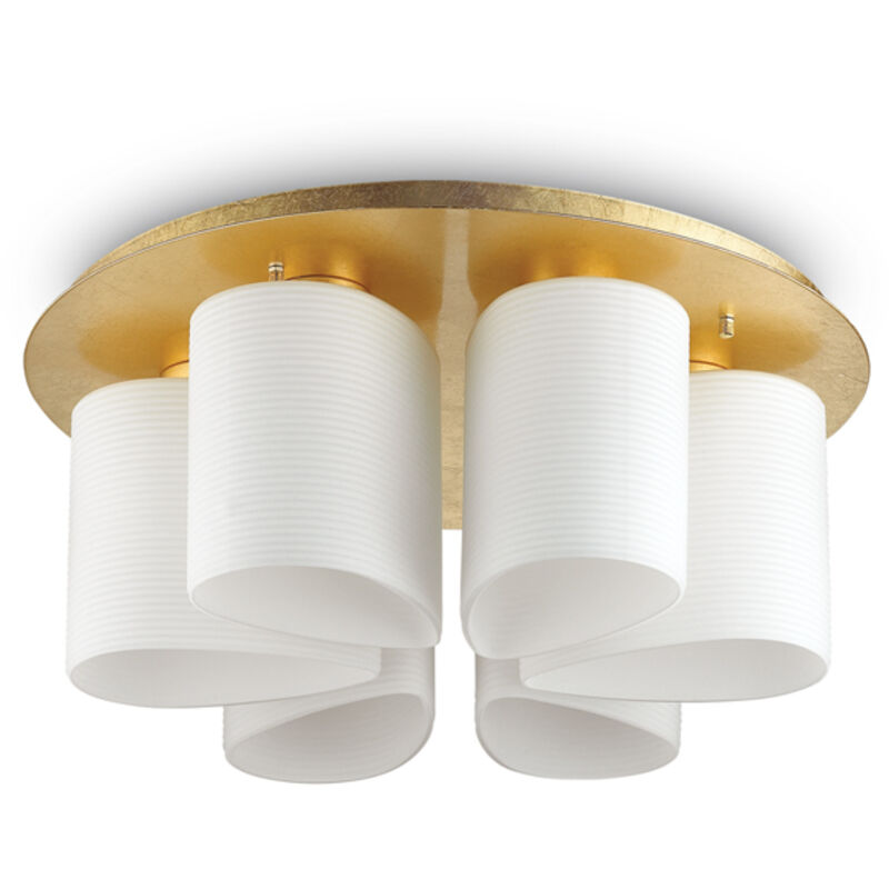 Base in metallo rifinita con foglia oro. Diffusori in vetro soffiato bianco, acidato e con rigatura in rilievo. Ø 60 x H 25,5 cm E27 max 6 x 60W IP:20