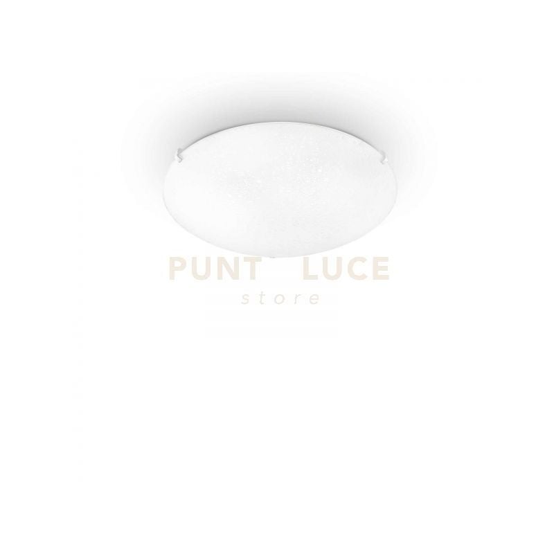 Plafoniera con diffusore in vetro trasparente con decorazioni serigrafate all'interno e sabbiato all' esterno. Ganci ferma vetro in metallo cromato.