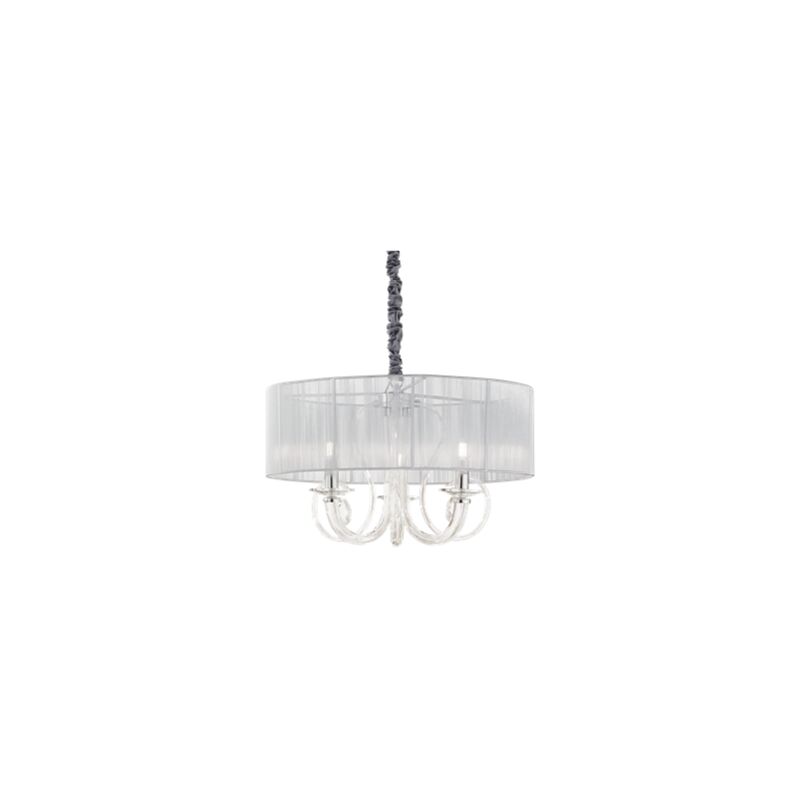 Montatura in cromo. Corpo luce in vetro soffiato e lavorato a mano. Elementi decorativi in cristallo molato. Paralume in tessuto d'organza plissettato. Copricatena in velluto Ø 600 x H min 550 / max 1200 mm max 3 x 40W E14 / 230V