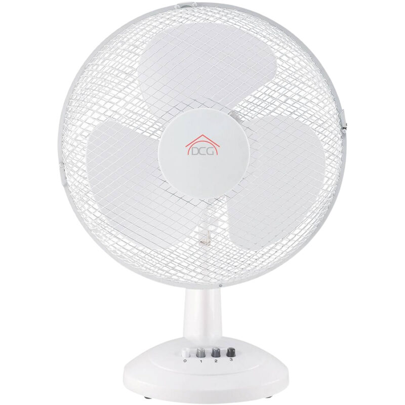 Ventilatore da tavolo con 3 pale, corpo in plastica e griglia di protezione in metallo. Selezionabili 3 velocità, oscillazione orizzontale ed inclinazione verticale regolabile.