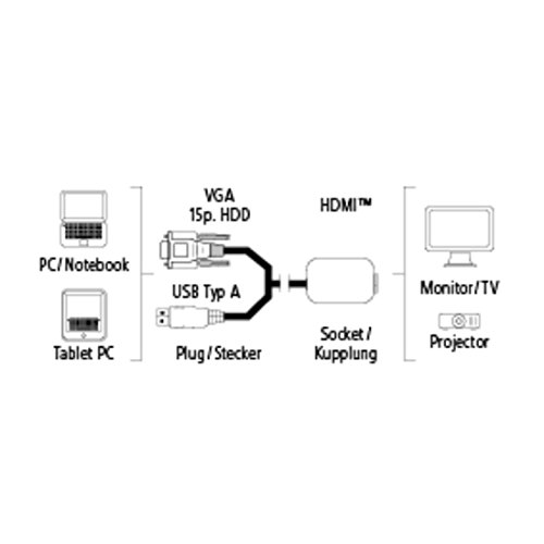 Per il collegamento di PC/notebook/tablet con uscita VGA a un monitor/televisore o proiettore HDMI: converte il segnale analogico VGA in un segnale digitale HDMI.