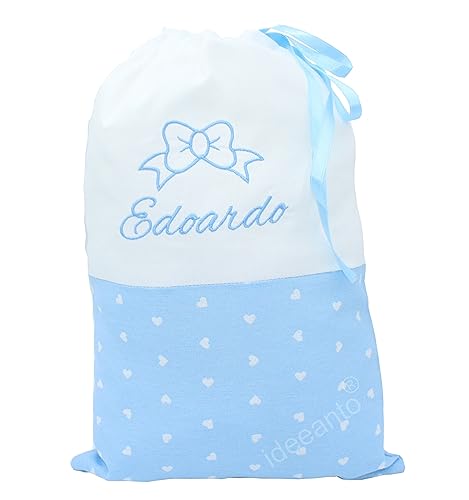 Ideeanto Sacchetto sacca primo cambio neonato ospedale con nome ricamato (Cuoricini celesti)