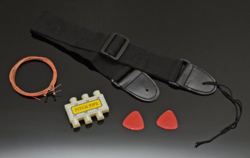 5 pezzi per chitarra acustica/western: custodia imbottita, cinghia, 6 corde in acciaio, diapason per l'accordatura e due plettri.
