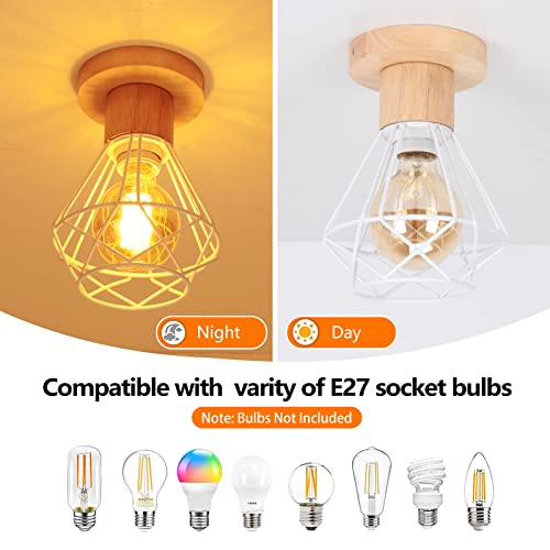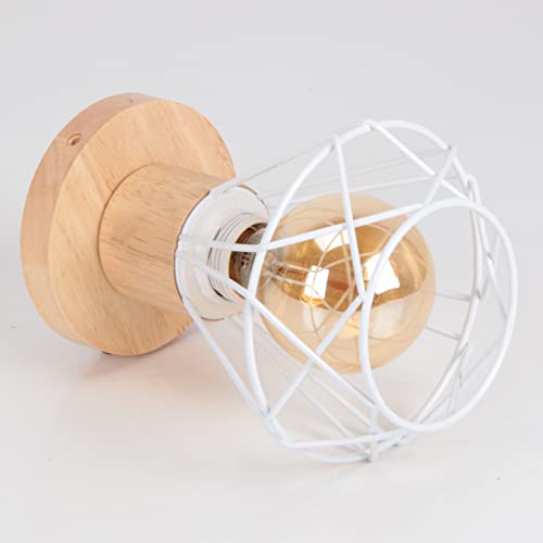 IDEGU 3 Pezzi Lampade a Sospensione Vintage Industriale, Lampada da Soffitto in Legno e Metallo Bianco Gabbia Geometrica 16cm Retro E27 Lampadario Interni per Corridoio Camera da Letto Cucina