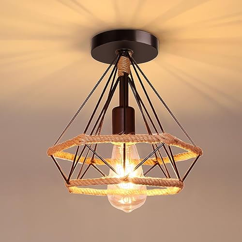 IDEGU 2 Pezzi Plafoniera Vintage 25CM E27 Lampadario Soffitto Industriale Design Gabbia in Metallo e Corda di Canapa Retrò Lampada da soffitto per Corridoio Portico Camera da Letto