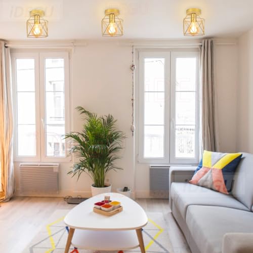 IDEGU 2 Pezzi Plafoniere E27 Vintage Lampada da Soffitto Design Industriale in Forma di Gabbia Esagono 15cm Paralume Matal Oro Retro Lampadario da Soffitto per Camera da Letto, Cucina, Corridoio