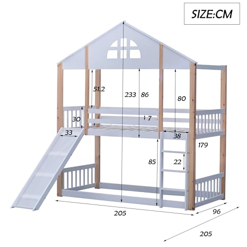 Idemon Letto a castello con finestre e scale angolari a tre livelli, lettino con scivolo, letto con recinzioni e protezione anticaduta, telaio in legno massello, bianco+naturale, 90 x 200 cm