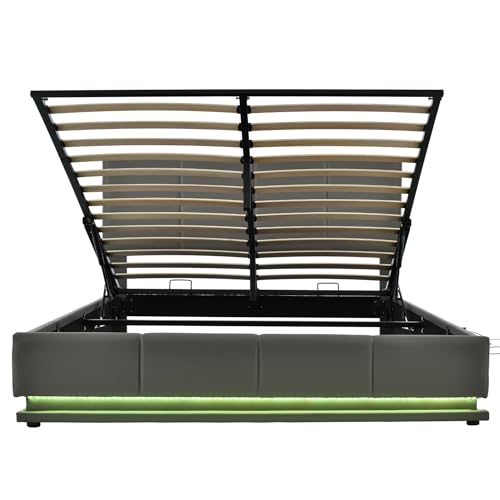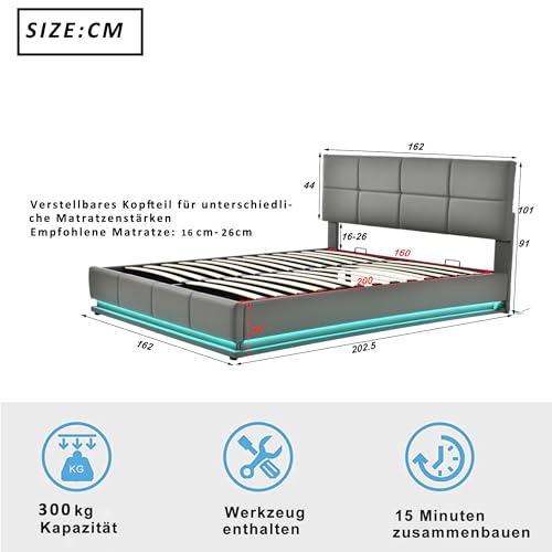 Idemon Letto imbottito 160 x 200 cm con LED, doghe in metallo e cassetta, letto matrimoniale con testa imbottita regolabile in altezza e spazio idraulico (senza materasso) (grigio), LDU00056