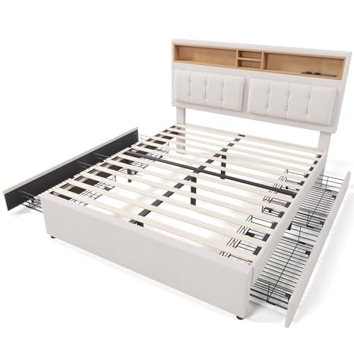 Idemon Letto matrimoniale con 4 cassetti e presa USB C, letto imbottito, testiera regolabile in altezza, rete a doghe in legno (senza materasso) (beige chiaro, 160 x 200 cm)