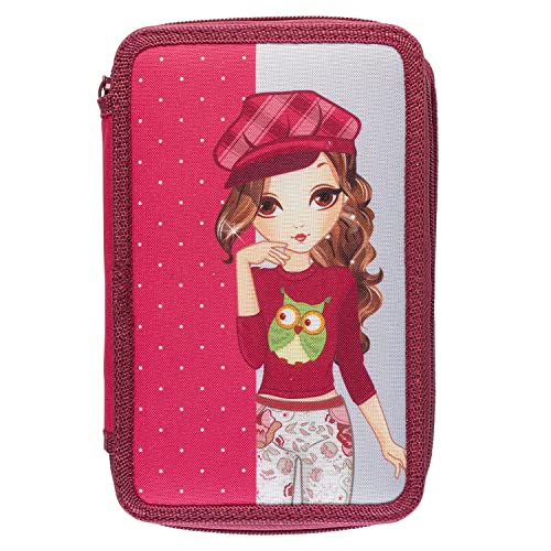 Pratico astuccio portamatite per bambine con 47 pezzi in rosso e rosa con puntini bianchi, decorato con un incantevole motivo femminile sul davanti