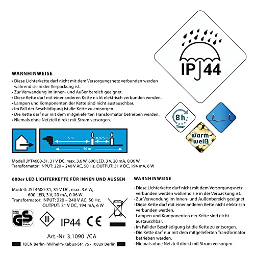 Idena 31090 - Catena luminosa a LED con 600 LED in bianco caldo, con funzione timer 8 ore e trasformatore, in scatola di plastica, uso interno ed esterno, come decorazione per feste, Natale