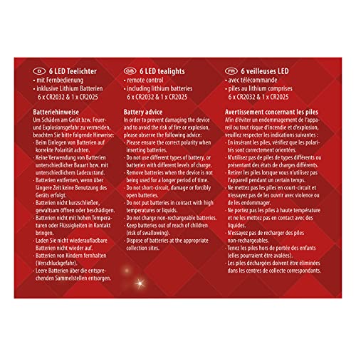 Ogni candela ha un vano batteria sul fondo per una batteria CR2032 o 2 batterie AA (candele a colonna) e può quindi essere accesa e spenta in modo flessibile indipendentemente da una fonte di alimentazione e dalle altre luci.