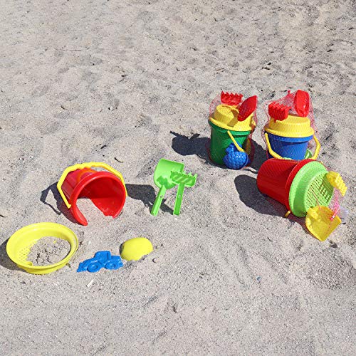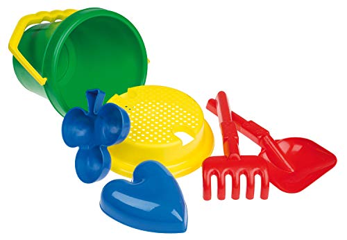 Idena 7113460 - Set di giocattoli di sabbia 6 pezzi composto da secchio, setaccio, 2 formine, rastrello e paletta, diversi colori, per giocare in spiaggia e nella sabbiera