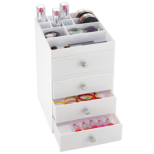 Questo organizer bagno ha 11 scomparti di diversa misura e un cassetto: è una cassettiera per trucchi che permette di sistemare ogni cosa con ordine.