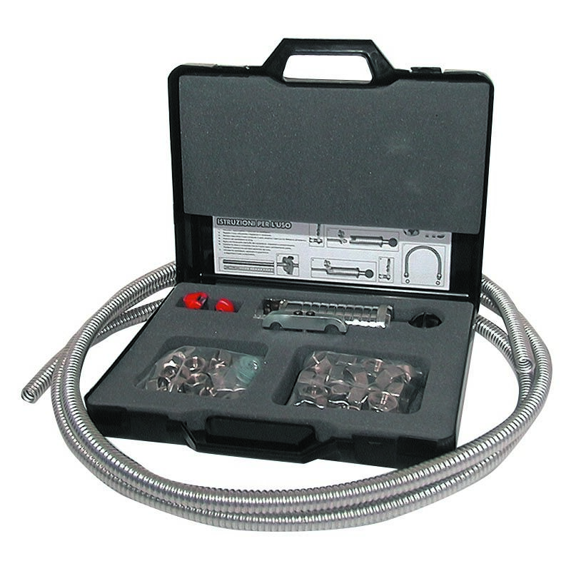 Idoneo anche per solare. Idoneo al trasporto di acqua potabile. Il kit è composto da: - 1 valigetta in ABS con alloggiamenti - 1 cartellatrice universale per tubi 3/8-11/4 - DN10/25 - 1 tagliatubo per tubi 3 - 35 mm - 1 dima 1/2-3/4 - DN12/15 - 1 rotolo di tubo CSST AISI 304 DN12 - 1/2- 4 m - 1 rotolo di tubo CSST AISI 304 DN15 - 3/4- 4 m - 20 dadi 1/2con guarnizione - 20 dadi 3/4con guarnizione