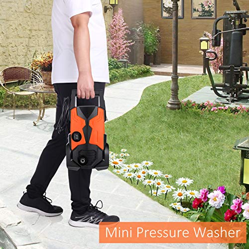 【PORTATILE E FACILE DA CONSERVARE】: L'idropulitrice ha dimensioni compatte, design leggero e colori brillanti, facile da spostare con la maniglia. Per una maggiore portata vengono forniti un avvolgitubo ad alta pressione da 5 m / 16,4 piedi e un cavo di alimentazione da 5 m / 16,4 piedi con GFCI in linea. Consentendo di utilizzare in sicurezza questa macchina senza problemi di sicurezza. Il gancio del c