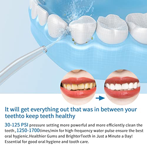 【10 livelli di pressione dell'acqua regolabili】 L'idropulsore dentale professionale di nuova concezione è in grado di controllare la pressione dell'acqua in modo fluido e preciso, erogando 1.700 volte al minuto, sciacquando e rimuovendo la placca tra le gengive e favorendo la circolazione sanguigna. La pressione dell'acqua 1-4 è adatta a persone con denti sensibili, utenti principianti (consigliato quando si u
