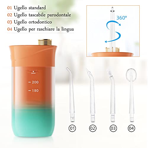 Idropulsore Dentale Portatile,200ml Irrigatore Orale,Pulizia Dentale di Pressione Dell'Acqua con 3 Modalità/4 Ugelli di Ricambio,Idropulsore Orale USB Ricaricabile IPX7 Impermeabile per Igiene Dentale