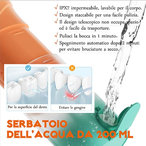 【IPX7 Waterproof】 Il serbatoio dell'acqua portatile Idropulsore ha una capacità fino a 200 ml, che soddisfa le esigenze di pulizia della bocca in una volta sola. Idropulsore dentale adotta un design staccabile del serbatoio dell'acqua, che è comodo per pulire lo sporco nel serbatoio dell'acqua in tempo, pulire i denti è più igienico e il design a scomparsa aumenta anche la comodità di uscire.