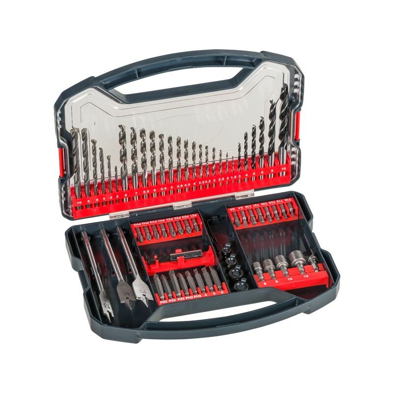 Valigetta in plastica ultra-resistente con manico integrato. Bit e portabit al cromo-vanadio. Composizione box: 24 bit misti, 4 bit con arresto profondità, 1 portabit magnetico, 14 punte per metallo, 5 punte per muratura, 5 punte per legno, 3 mecchie per legno, 1 svasatore per legno, 4 fermapunta, 1 chiave maschio esagonale.