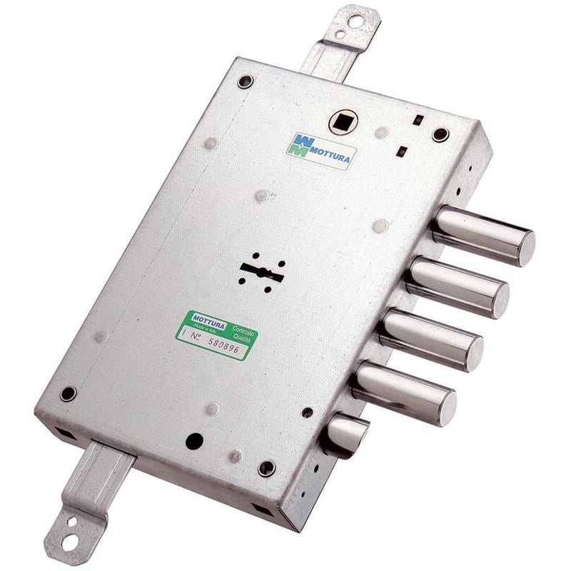 Serratura da applicare a doppia mappa. 4 mandate, chiusura triplice con mezzogiro, corsa chiavistelli mm. 40, corsa aste mm. 20, senza aste, 3 chiavi mm. 60 (lunghe).