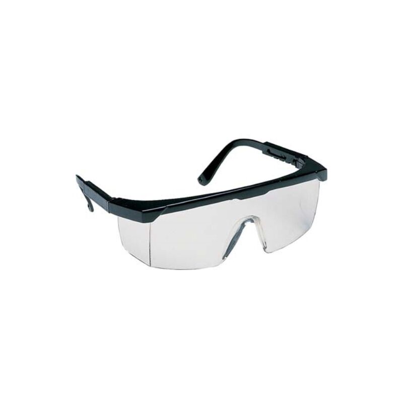 Con montatura in nylon e stanghette regolabili. Lenti trasparenti in policarbonato con protezione laterale.
