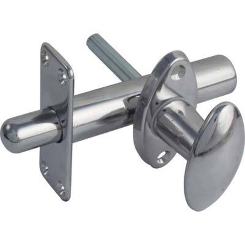 Chiusura supplementare interna. Perno in acciaio. Diametro catenaccio Mm. 14, corsa Mm. 25. Interasse Mm. 80. Completo di incontro da Mm. 24x65.