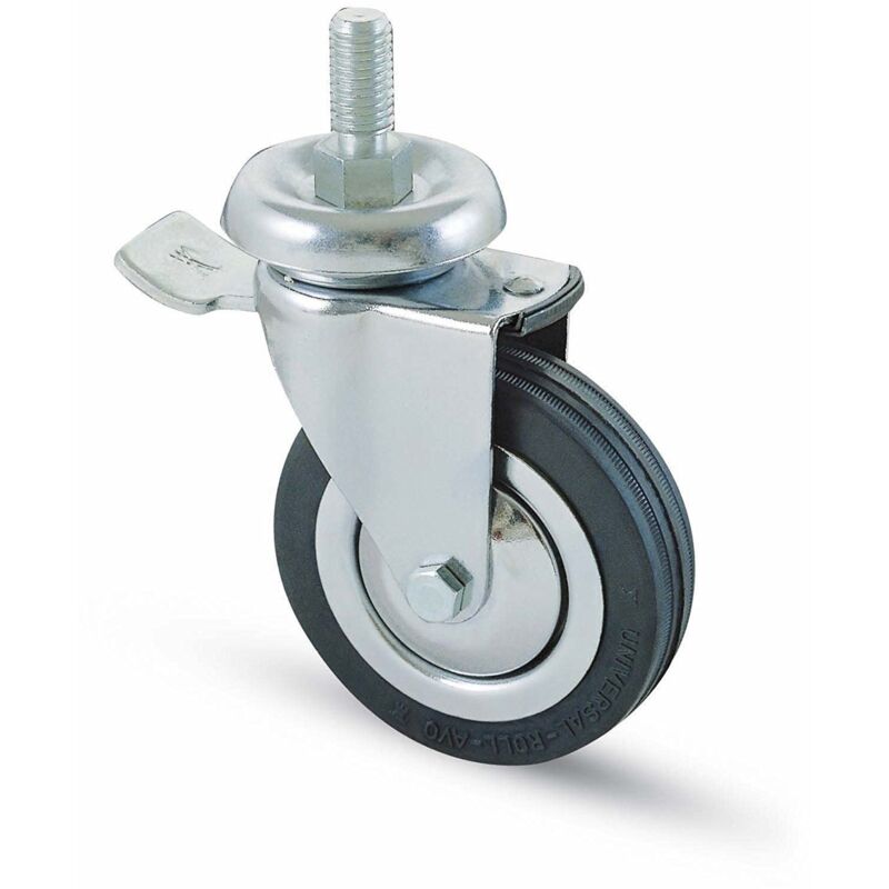 In gomma, supporto in acciaio cromato rotante su corona di sfere, assemblaggio con dado autobloccante, con bloccaggio ruota.NLNL