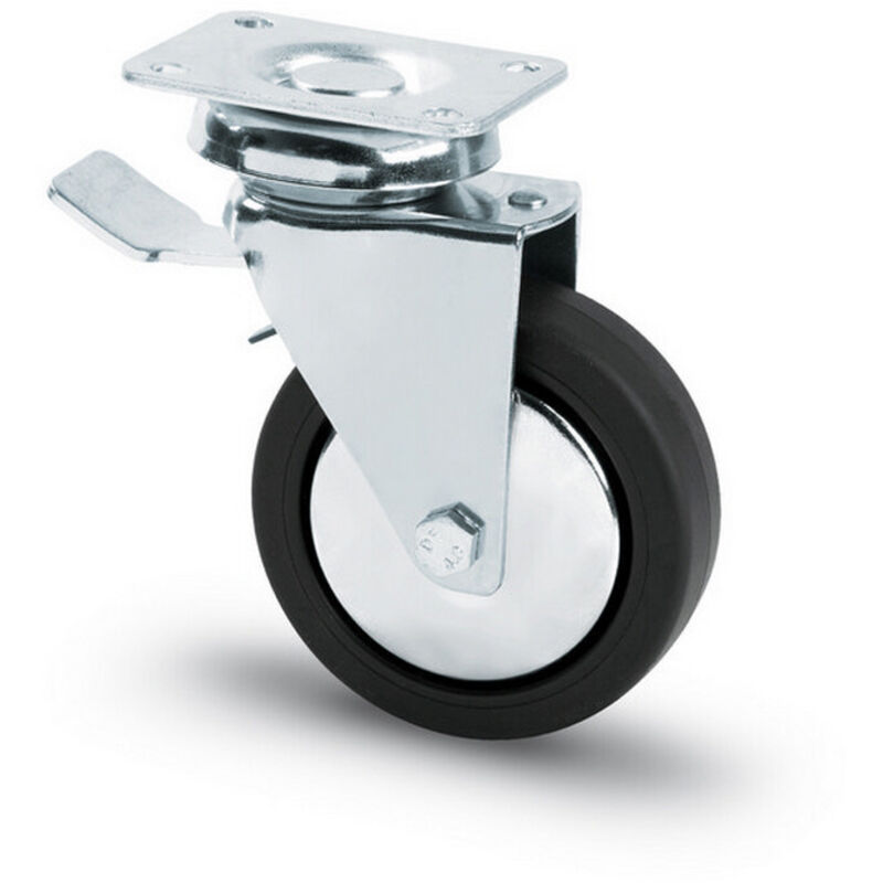 In gomma, supporto in acciaio cromato rotante su corona di sfere, assale imbullonato, con bloccaggio ruota e piastra.