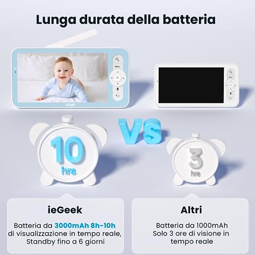 Visione Ad Alta Qualità- FHD 1080P: ieGeek baby monitor dispone di un sensore COMS avanzato, con un filtro automatico IR-Cut professionale, fornisce immagini nitide 1080P FHD alla luce del giorno, e la visione notturna ha una grande chiarezza, in modo da non dover più alzarsi per controllare il vostro bambino di notte, può essere facilmente fatto sullo schermo. Il baby monitor supporta anche uno zoom 4x, Lasciati osse