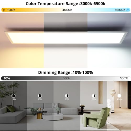 【Gestione del colore dimmerabile e CCT】La plafoniera a pannello LED può essere controllata tramite il telecomando. Con una potenza fino a 4400 lumen, offre un'elevata luminosità. La luminosità può essere regolata in modo continuo tra il 10% e il 100%. Può anche essere commutato liberamente tra tre temperature di colore (3000K-6500K): bianco caldo, bianco neutro e bianco freddo.