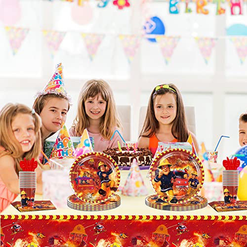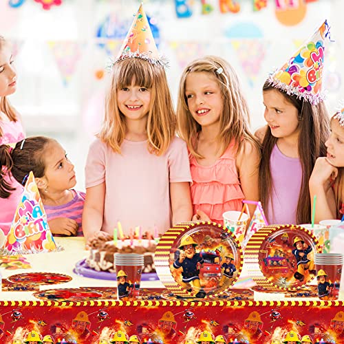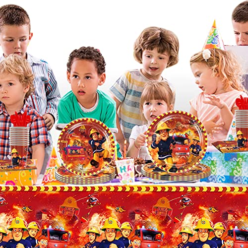 IFHDO Fireman Sam Set Stoviglie per Festa di Compleanno Decorazione per Feste di Compleanno Tema Forniture per Feste Stoviglie di Compleanno per Bambini Piatto Tovagliolo Tazza Tovaglia,10 Ospiti
