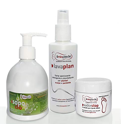 Risolvi definitivamente il problema del cattivo odore di piedi e scarpe! Il pack conviene, 3 prodotti ad un costo vantaggioso. 3 prodotti specifici per l'igiene dei tuoi piedi e delle scarpe. Sapoclò lava e deterge la pelle, Sudorstop crema antisudorazione con azione immediata e Lavaplan per igienizzare e rinfrescare plantari, scarpe e pantofole.