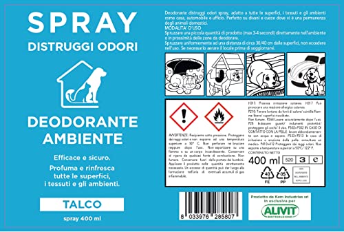 IGIENIPLUS SPRAY Distruggi Odori per Ambienti e Tessuti - Purifica gli Ambienti/Superfici/Tessuti frequentati da Cani e Gatti senza alterare le loro Proprietà Olfattive. Spray 400ml (Talco)