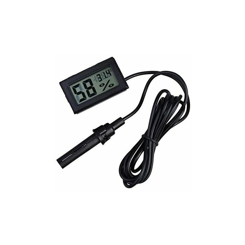 Risoluzione dell'umidità: 1% RF Alimentazione: 2 batterie a bottone LR44 da 1,5 V (non incluse) Specifiche Misurazione del tasso di umidità: 10% rF h99% rF Precisione umidità: + 5 / -5% Risoluzione umidità: 1% rF Intervallo di temperatura: -50�C, 70�C Temperatura precisione: + 1 / -1 �C Risoluzione del display della temperatura: 0,1�C Tensione di esercizio: 1,5 V, dimensione della cella LR44 con un tasto Dimensioni: ca. da 48 mm a 9 mm a 15 mm Dimensioni LCD: ca. 46 mm a 27 mm Alimentazione: 2 batterie a bottone LR44 (non incluse) Lunghezza cavo sonda: 1,5 m Il colore nero Contenuto della confezione: 1 X termometro igrometro LCD