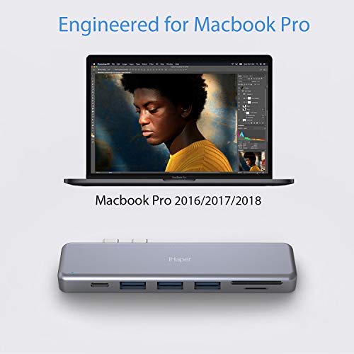 【Hub tipo c multifunzione 7-in-1】Questo è un usb c adattatore appositamente progettato per MacBook Pro 2018/2017/2016.Espandi le doppie porte USB-C a una porta di thunderbolt 3 tipo-c,una porta di uscita video HD,triplo porte USB 3.0,uno slot per scheda SD e uno slot per scheda Micro SD,Supporta lo scambio a caldo.