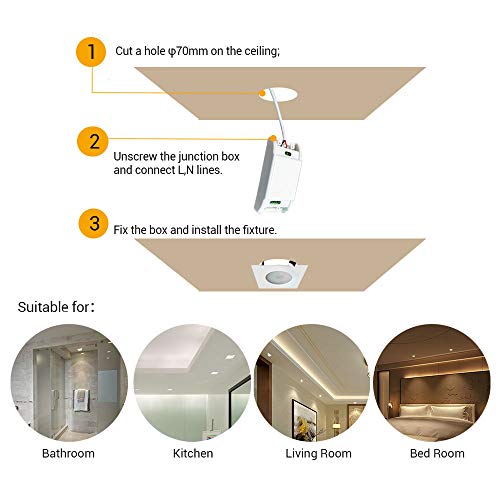 Installazione semplice e più sicurezza e rispetto per l'ambiente - ①Necessario un foro (profondità: larghezza 28mm: 69mm) sul soffitto ② collegamento del filo sotto tensione e filo zero ③ regolare il raccordo. Non c'è sfarfallio. Nessun UV Nessun piombo o mercurio. Nessun'altra radiazione deleteria. Funziona a 220-240 V. Nessun hub richiesto.