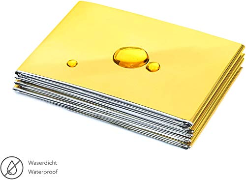 Usando materiali in latta suprema questi mantengono il calore, Il lato dorato di questo foglio di emergenza protegge dal calore , Il lato argento protegge dal raffreddamento eccessivo e dal freddo