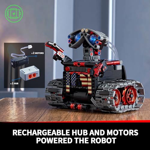 【Aspetto Cool】 Il processo di galvanizzazione unico conferisce al robot un aspetto elegante e resistente. Composto da 560 pezzi in plastica ABS di alta qualità, è facile da montare e smontare. Gli occhi del robot e i tubi trasparenti possono illuminarsi, con i colori che cambiano in risposta ai comandi del telecomando: verde per avanti, rosso per indietro e blu per le altre direzioni. Inoltre, il robot dispone di una testa rotante, braccia regolabili, mani afferranti.