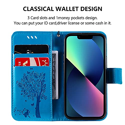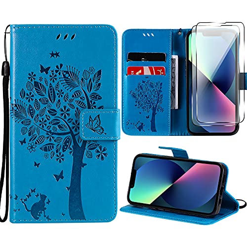 Ikziwreo Cover Compatibile con iPhone 13, [2 Pezzi Pellicola in Vetro Temperato] Flip Portafoglio Custodia Pelle PU Case 6,1 Pollici [Slot per schede] [Chiusura Magnetica] [Funzione Stand] - Blu