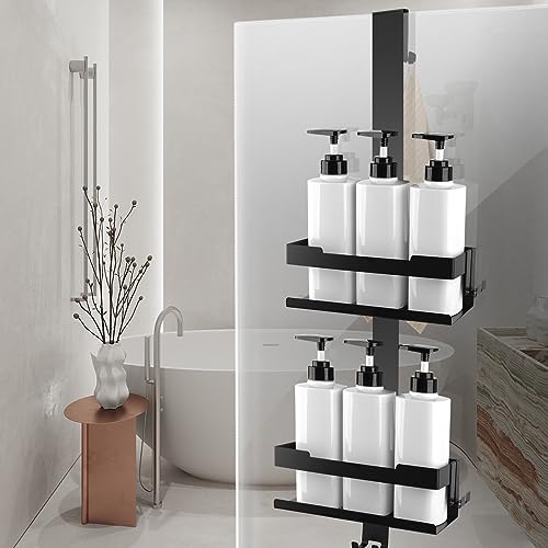 ILIKEPOW Organizer da doccia da appendere in acciaio inox a doppio strato, mensola per doccia, cestino per porta in vetro, schermo doccia nero opaco, con 4 ganci staccabili