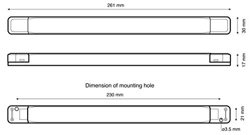INSTALLAZIONE: grado di protezione IP20, dimensione 261 x 30 x 17 mm (lunghezza × larghezza × altezza), temperatura ambiente (ta) -20 - +45 °C, temperatura di funzionamento (tc) 90 °C.
