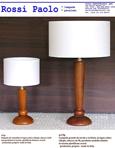 Idea illuminazione e arredamento: Lampada da tavolo in legno tornito color ciliegio con paralume modello cilindro in tessuto avorio accoppiato a plastica;