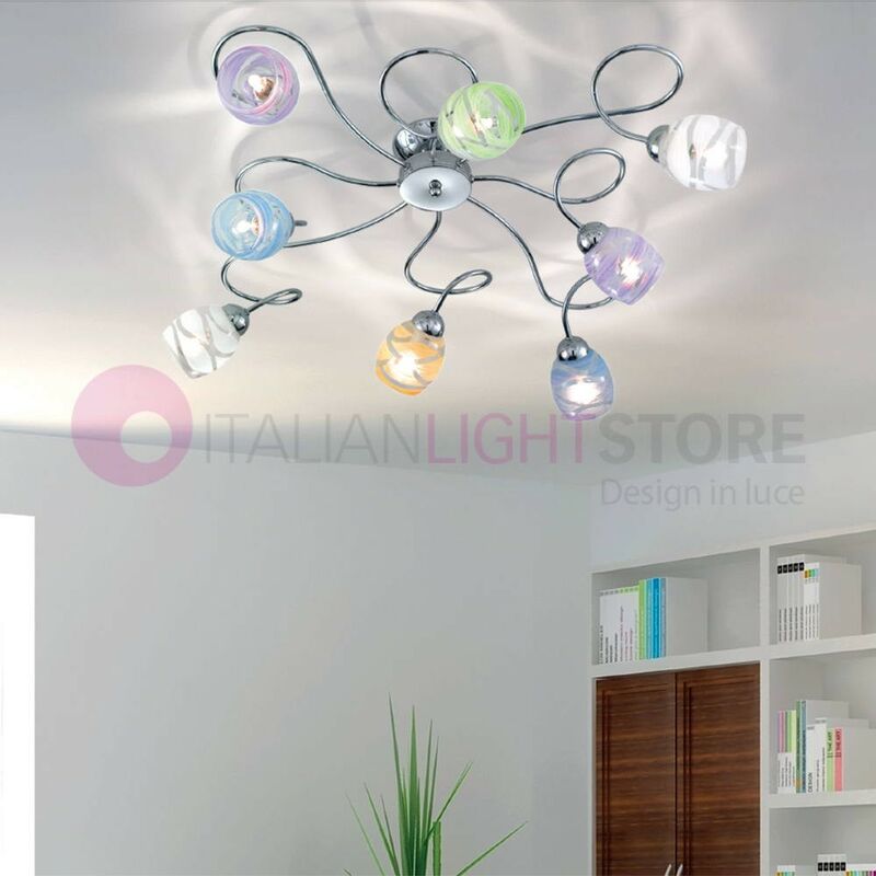 Lampada a Soffitto a 8 luci, in metallo cromato, con i vetri disponibili in vari colori, ideale per illuminare camerette, corridoi e camere da letto. Plafoniera a 8 Luci con struttura in metallo cromato;
