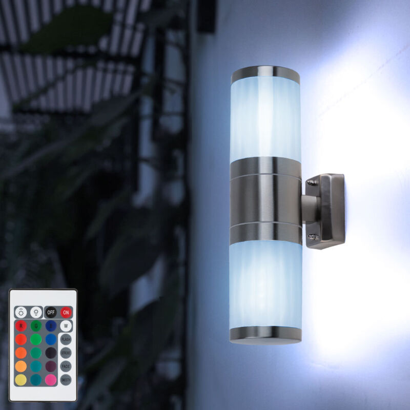 Descrizione Lampada da parete di design per uso esterno. Che sia sul terrazzo o sul balcone, questa lampada fa una bella figura ovunque. Grazie alla classe di protezione IP44, la lampada è protetta contro gli spruzzi d'acqua e quindi predestinato per uso esterno. Utilizzando il telecomando in dotazione, l'illuminante LED RGB può essere impostato in diversi colori e quindi fornisce atmosfera Rispetto alle luci normali, i faretti a LED consumano solo una quantità minima di elettricità e hanno un consumo persino inferiore rispetto alle luci a risparmio energetico. Questo protegge l'ambiente e il tuo portafoglio. Sono incluse due lampade LED RGB di alta qualità a risparmio energetico con telecomando per luce bianca e controllo RGB. Dettagli lampada • tipo di lampada: lampada da parete • materiale: acciaio inossidabile • paralume: plastica opale ( ondulato) • classe di protezione: IP44 • diametro paralume in cm: 10,2 • altezza x profondità in cm: 38 x 15,5 • Prese: 2x E27 • lampadine
