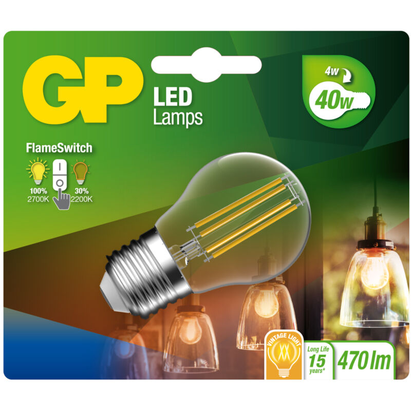 Gp Led M.globo Fila. Fs 4w E27Versione: GP LED Mini Globe FilamentFlameSwitch = 2 impostazioni di luce in una lampada: cambia l'atmosfera con l'interruttore a parete esistenteL'intelligenza è nella lampada stessa, quindi non è necessario alcun dimmerIl chip di memoria integrato ricorda l'ultima impostazione di luce sceltaAdattamento: E27Lampada forma: BulletPotenza: 40 WattConsumo energetico: 4 WattIntensità luminosa: 470 LumenEffetto luminoso: TrasparenteClasse di efficienza energetica: A++Voltaggio: 220 - 240 VoltTemperatura colore: da 2200K a 2700KLunghezza: 7,9 cmDiametro: 45 mmTempo di combustione: 15.000 oreDurata della vita: 15 anniDimmerabile: FlameSwitchPackage contenuto: 1
