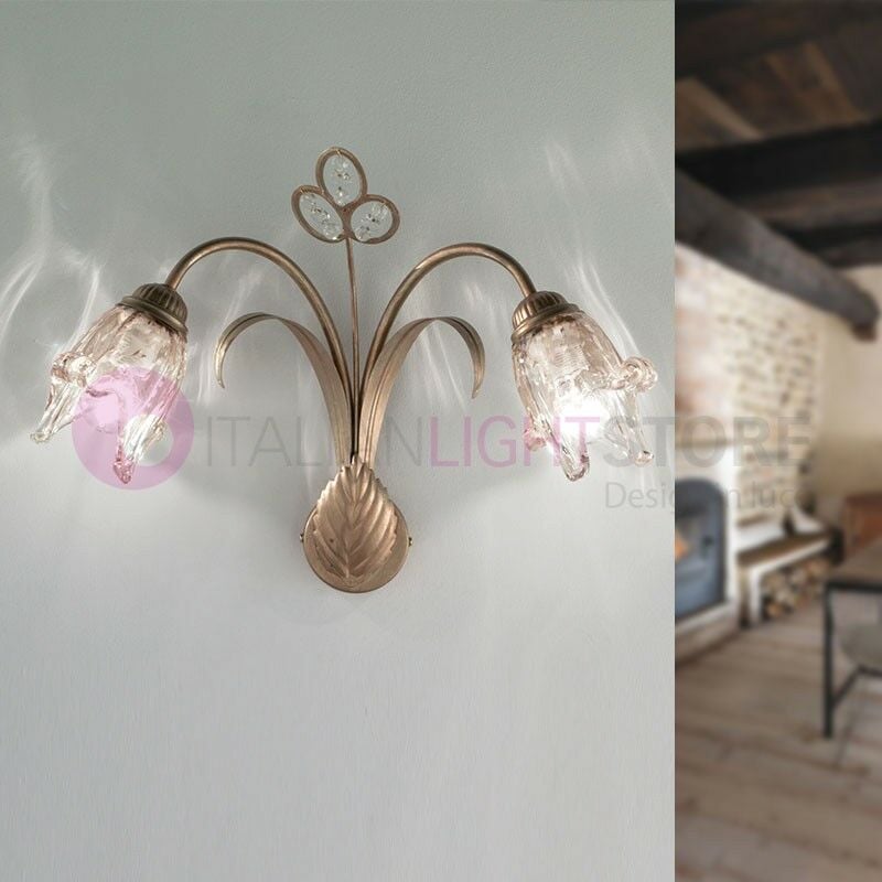 Lampada a parete Applique in stile classico a 2 luci, finitura oro francese, ideale per illuminare zone pranzo e camere da letto. Lampada a Parete a 2 Luci con struttura in metallo finitura oro francese (vernice oro opaco sfumato oro più chiaro) arricchita da foglie in metallo sagomato e perline in cristallo trasparente;