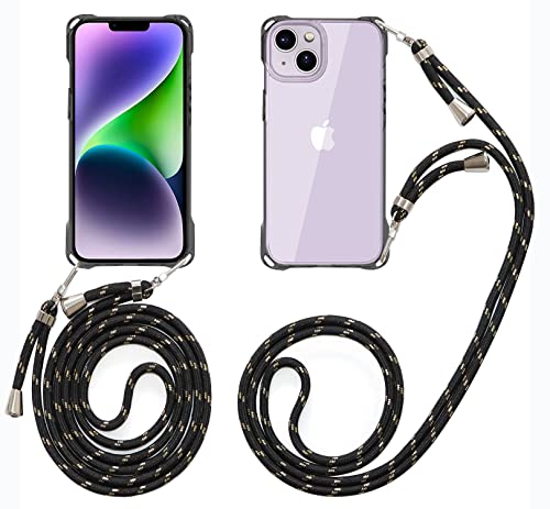 ILovecover Cover Trasparente con Cordino per iPhone 14,Custodia con Laccio Tracolla (Regolabile e Staccabile) Cellulare Girocollo Collana Silicone Protettiva Case,Nero-oro